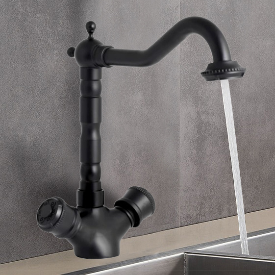 - Bateria kuchenna VIKI w kolorze czarnym matowym i stylu retro. Bateria jest dwuuchwytowa, posiada eko perlator i ceramiczne głowice. Bateria stojąca, zlewozmywakowa, do zlewu, kran do kuchni