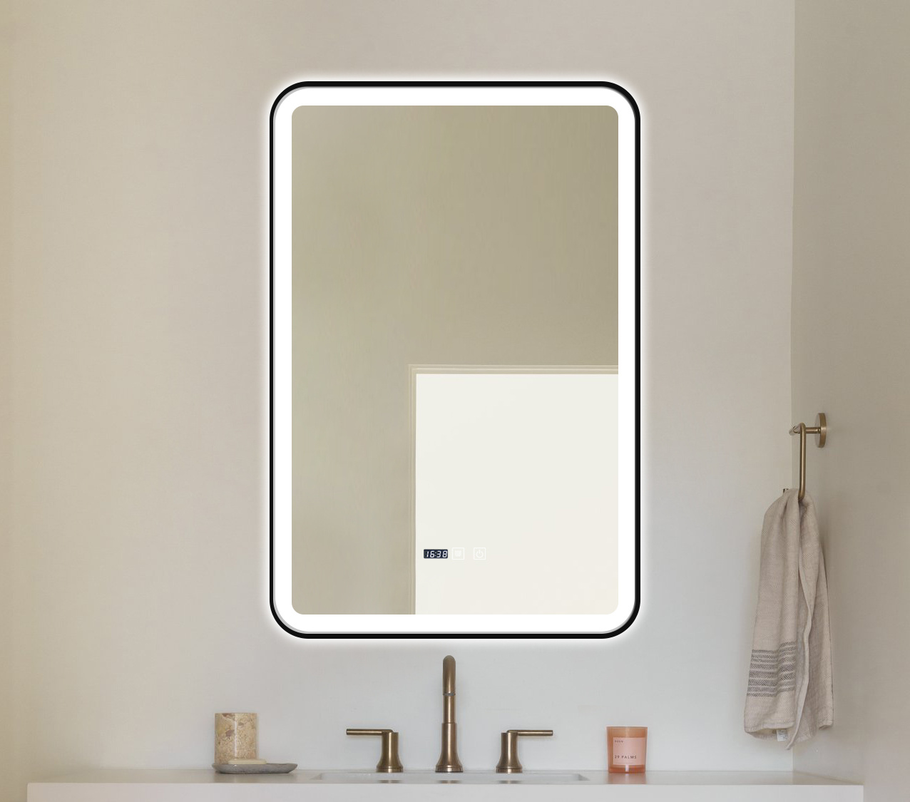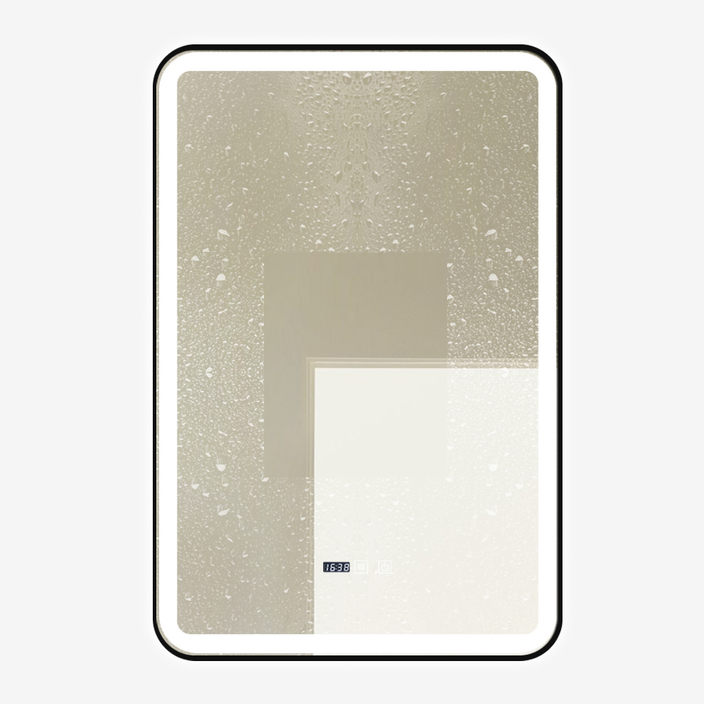 • Nowoczesne ścienne lustro z podświetleniem LED ledowym designerskie z podgrzewaniem ANTI-FOG czarna ramka zaokrąglone rogi, zegar, 3 barwy światła. Zastosowanie: łazienkowe, do salonu, do garderoby, do toaletki.
