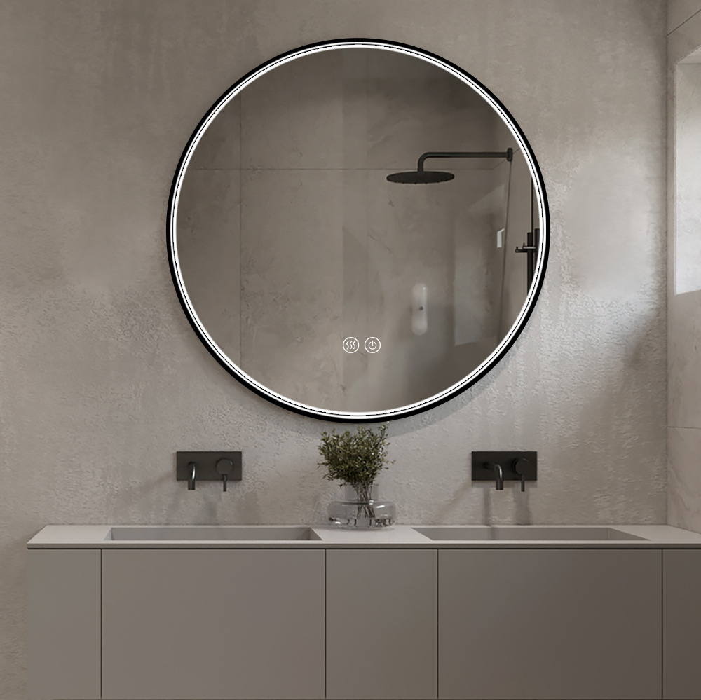 • Nowoczesne ścienne lustro z podświetleniem LED ledowym designerskie z podgrzewaniem ANTI-FOG w czarnej ramce 3 barwy. Zastosowanie: łazienkowe, do salonu, do garderoby, do toaletki.