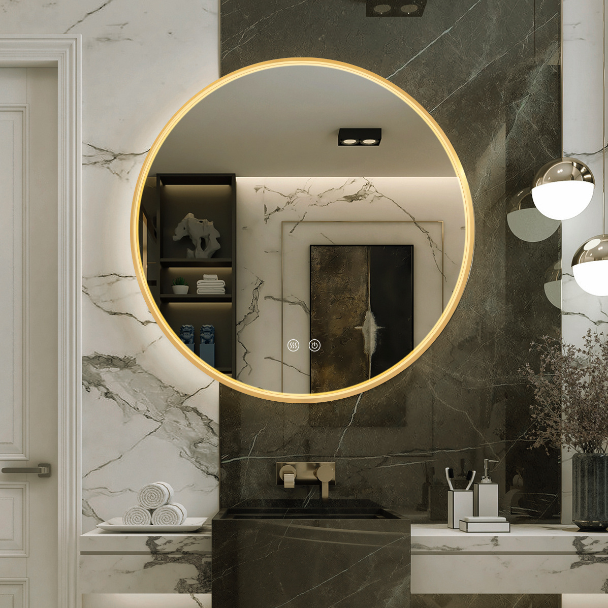 - Nowoczesne ścienne lustro z podświetleniem LED ledowym designerskie z podgrzewaniem ANTI-FOG w złotej ramce 3 barwy. Zastosowanie: łazienkowe, do salonu, do garderoby, do toaletki.