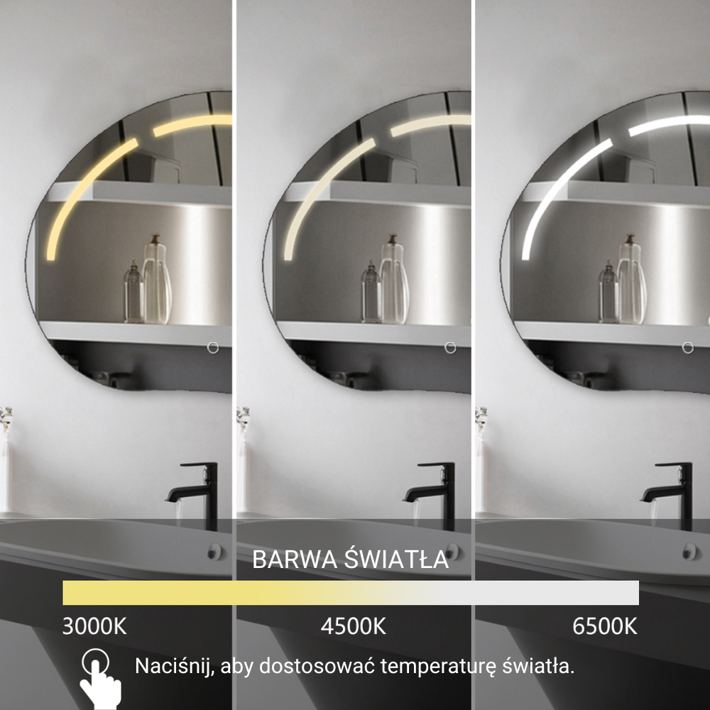 ✅ Nasze lustro z funkcją dotykowego wyboru barw to idealne rozwiązanie dla osób ceniących sobie komfort i elastyczność. Dzięki prostemu panelowi dotykowemu możesz w każdej chwili dostosować oświetlenie do swoich potrzeb – wybieraj pomiędzy chłodną bielą (6000K), ciepłym światłem (3000K) lub neutralnym blaskiem (4500K). Niezależnie od tego, czy przygotowujesz się na ważne wyjście, czy relaksujesz się wieczorem, zawsze znajdziesz idealne oświetlenie. Zmieniaj barwę światła, kiedy chcesz i dopasuj atmosferę do swojego nastroju!